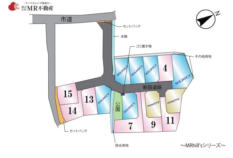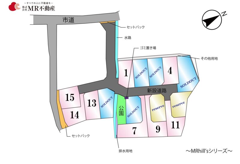 - 南側道路の幅員約5m、分譲地内道路の幅員約6m、東側里道1.5m